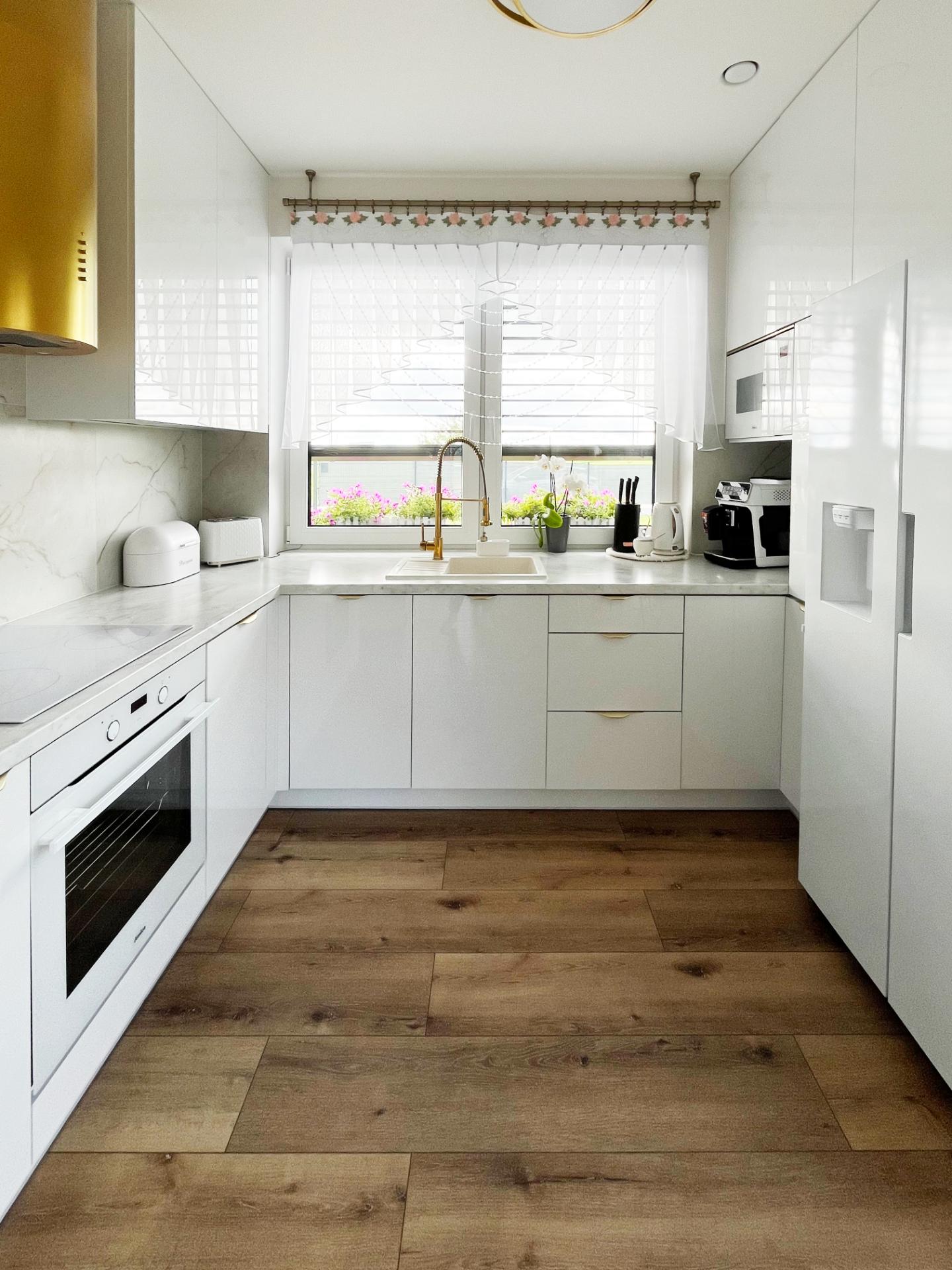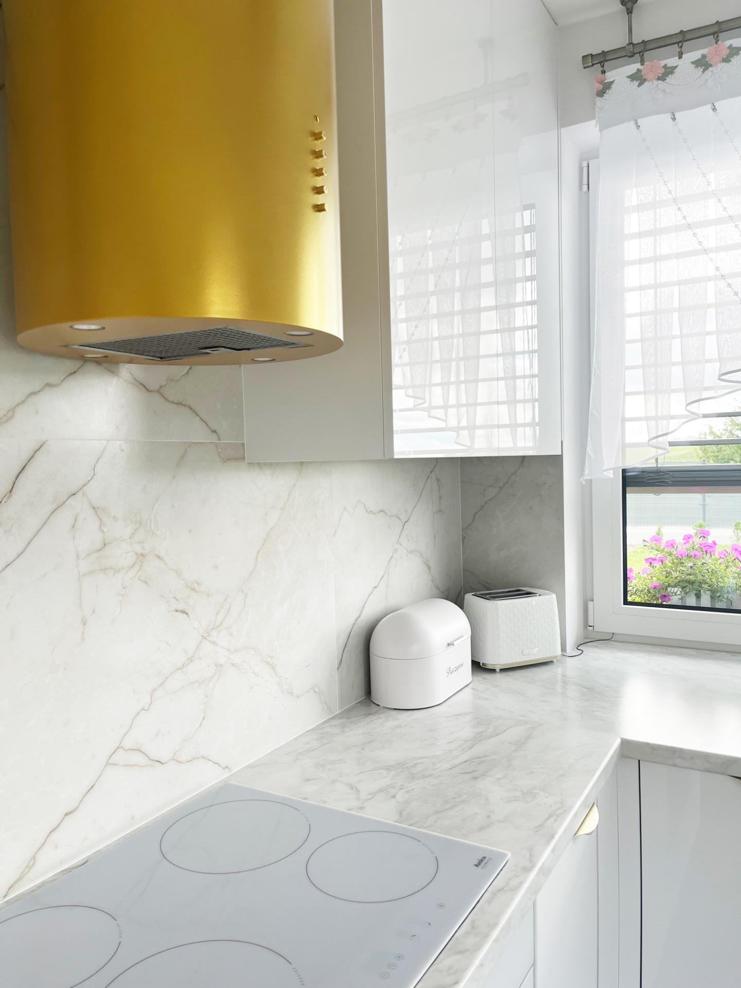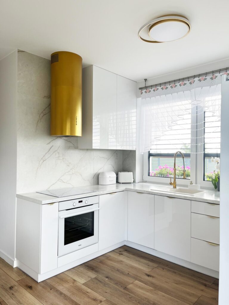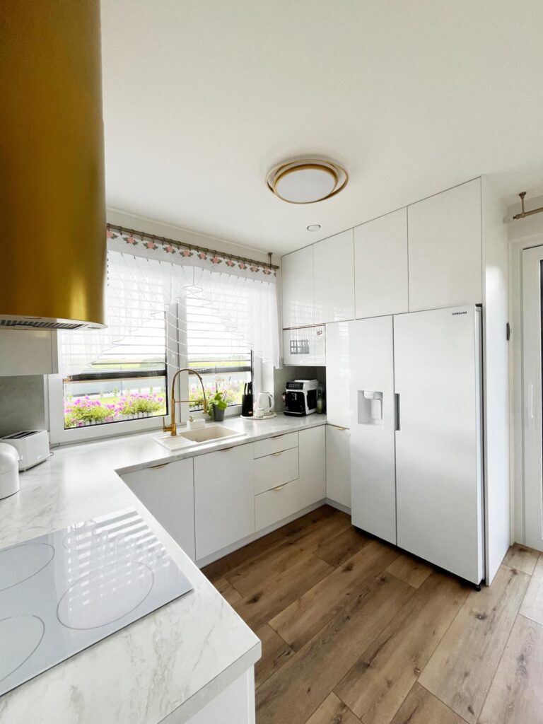 - Strefa okienna: Podwyższenie parapetu i zlicowanie go z blatem roboczym; bateria podokienna niekolidująca z otwieraniem skrzydła.