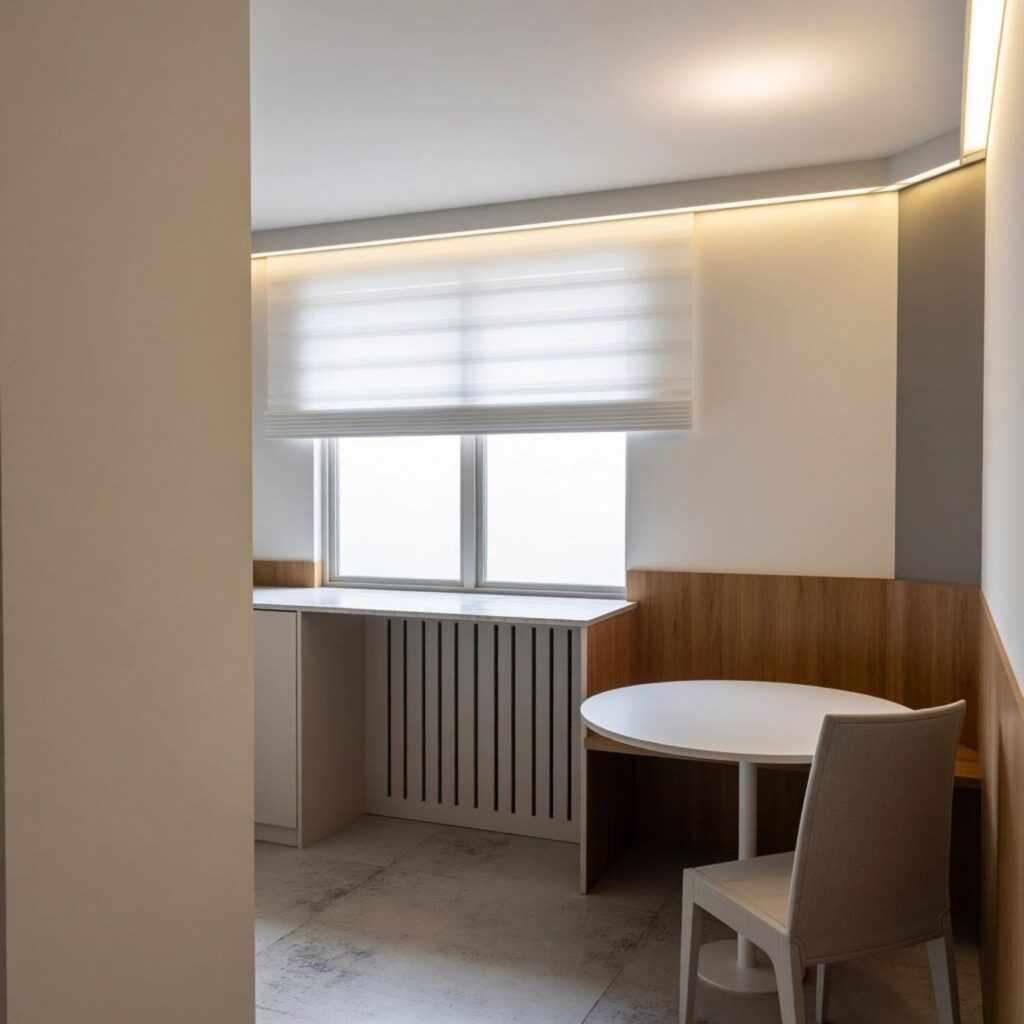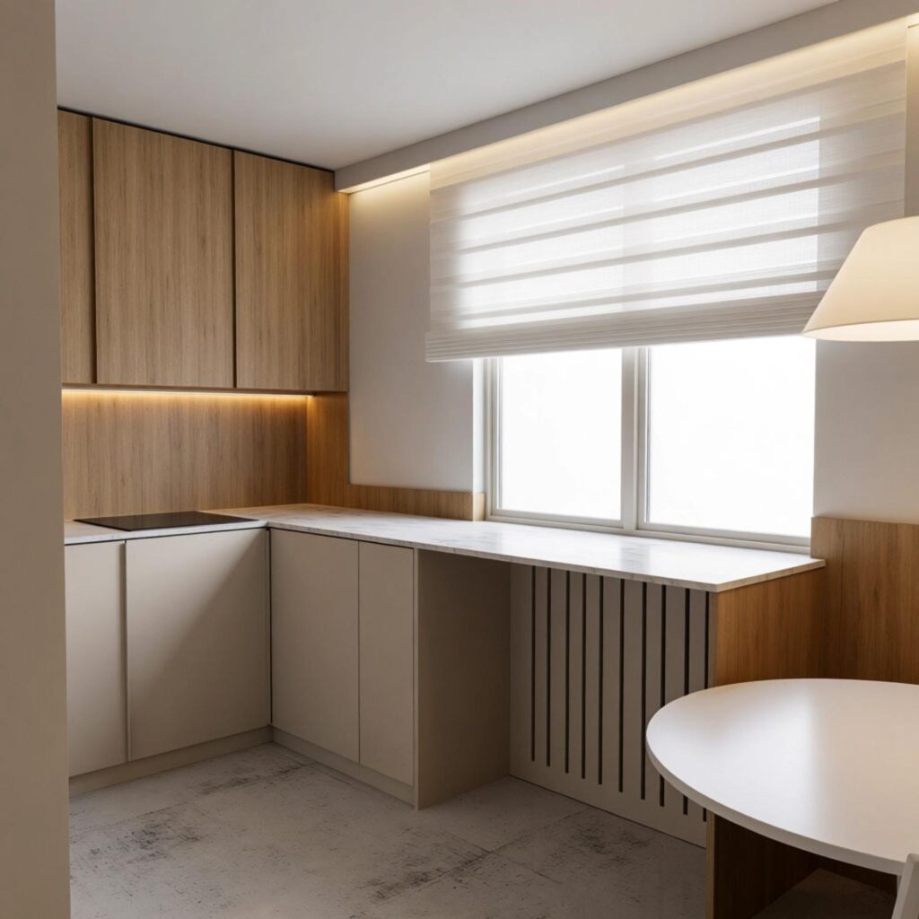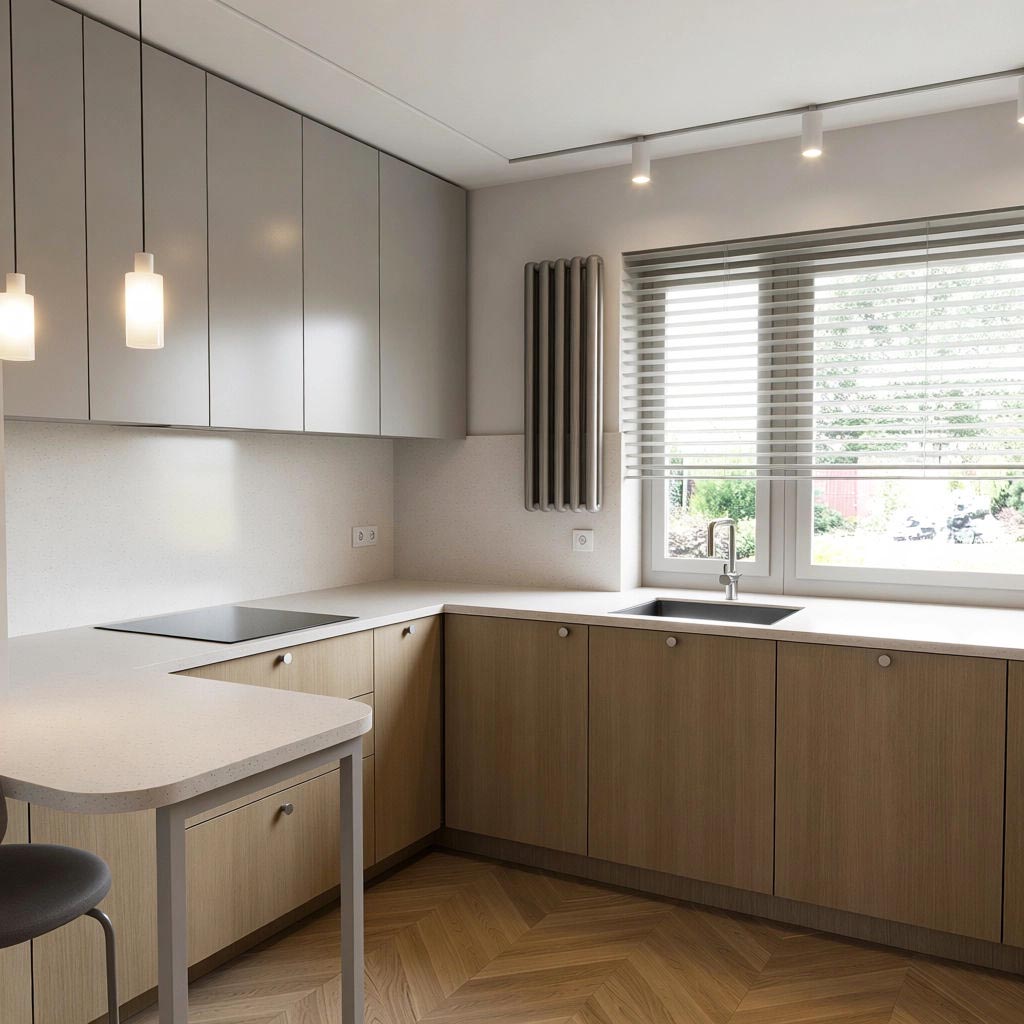 - Strefa okienna: Podwyższenie parapetu i zlicowanie go z blatem roboczym; bateria podokienna niekolidująca z otwieraniem skrzydła.