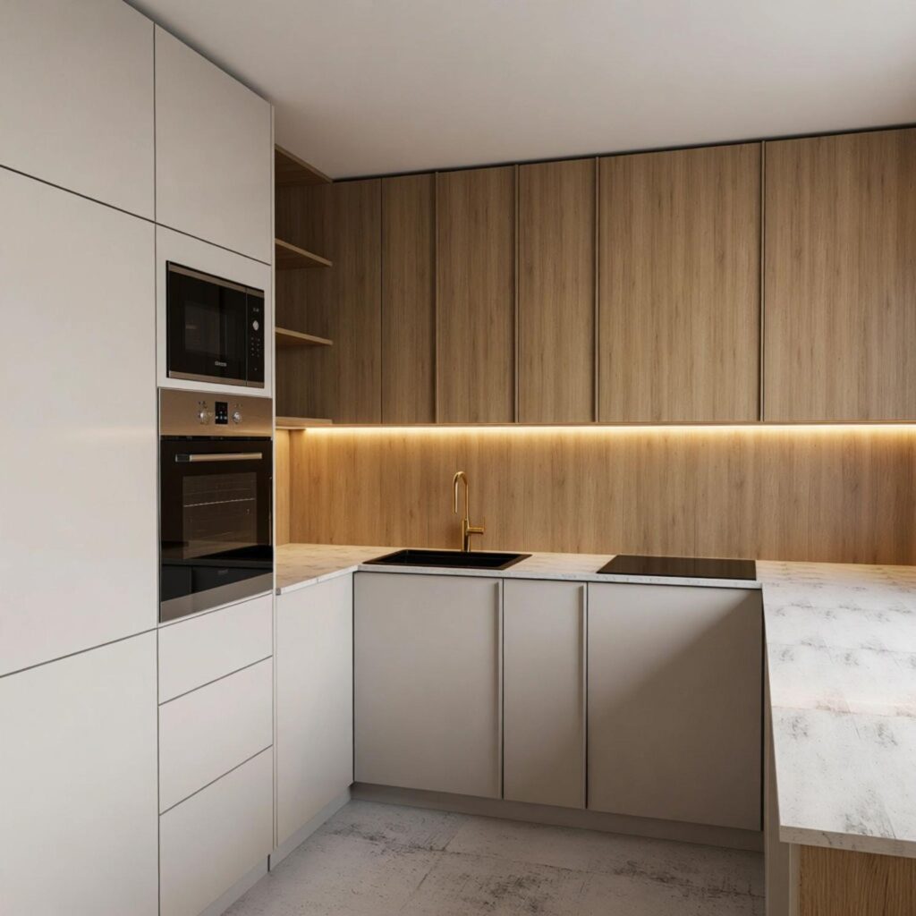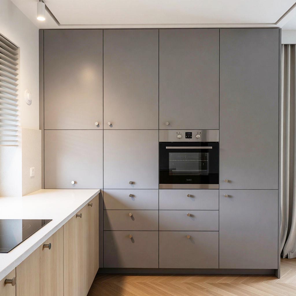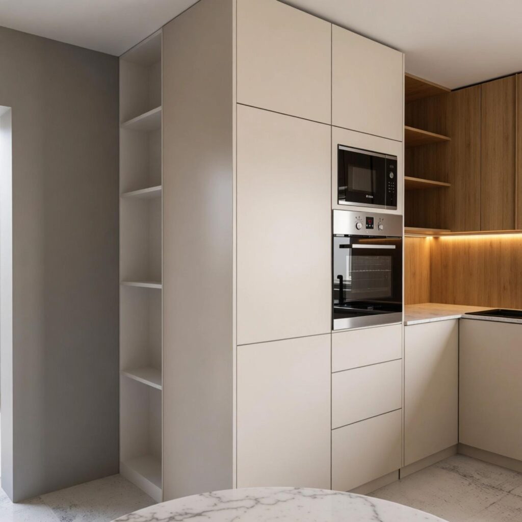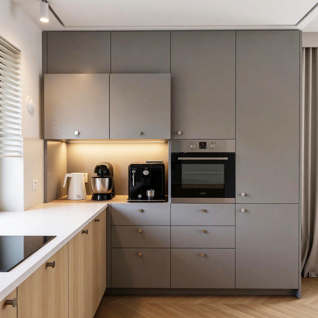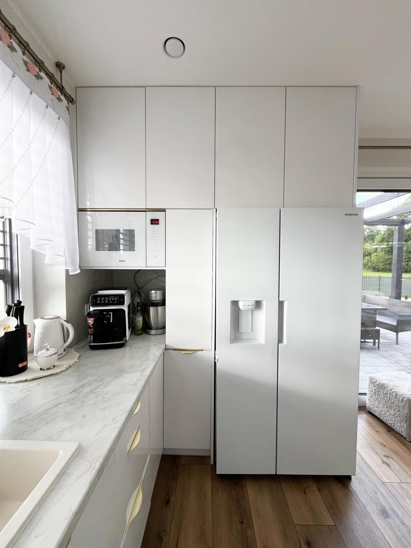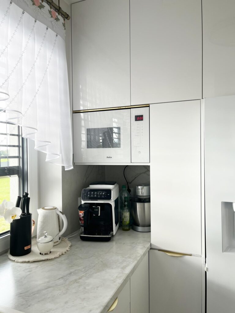 - Maksymalne przechowywanie: Wysoka zabudowa z ukrytą wnęką na drobne AGD (ekspres, toster) – porządek jednym ruchem ręki.