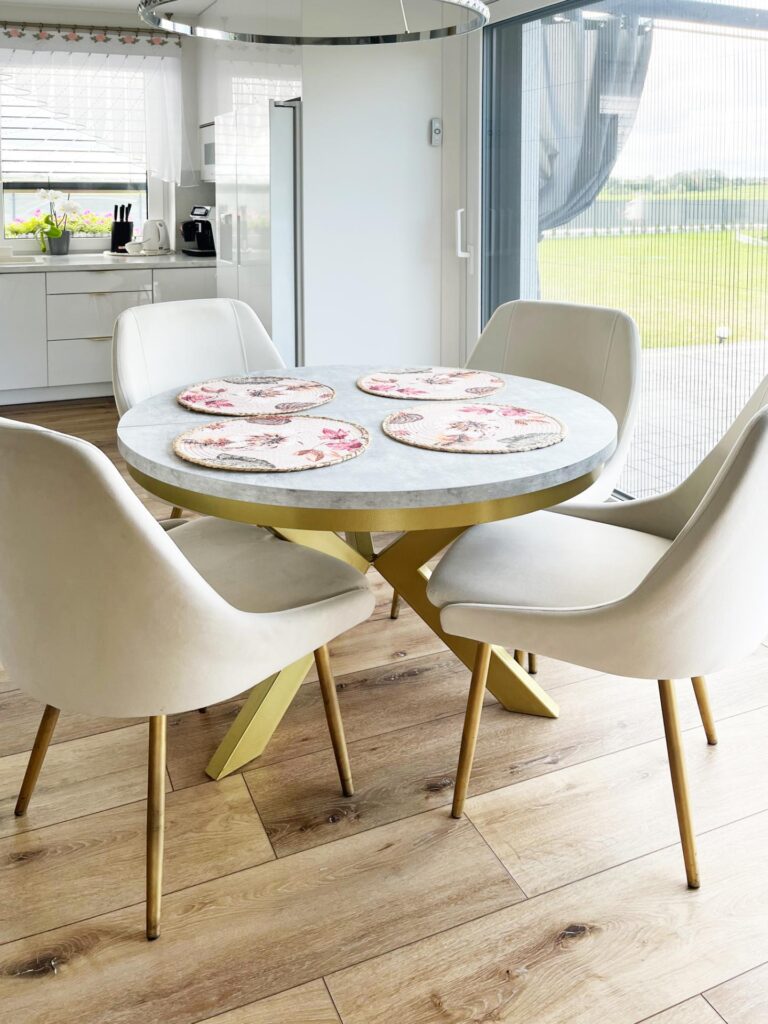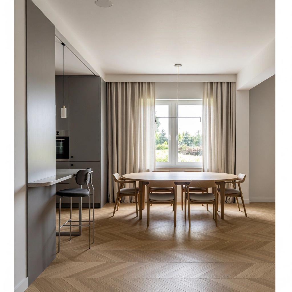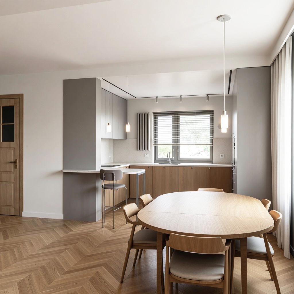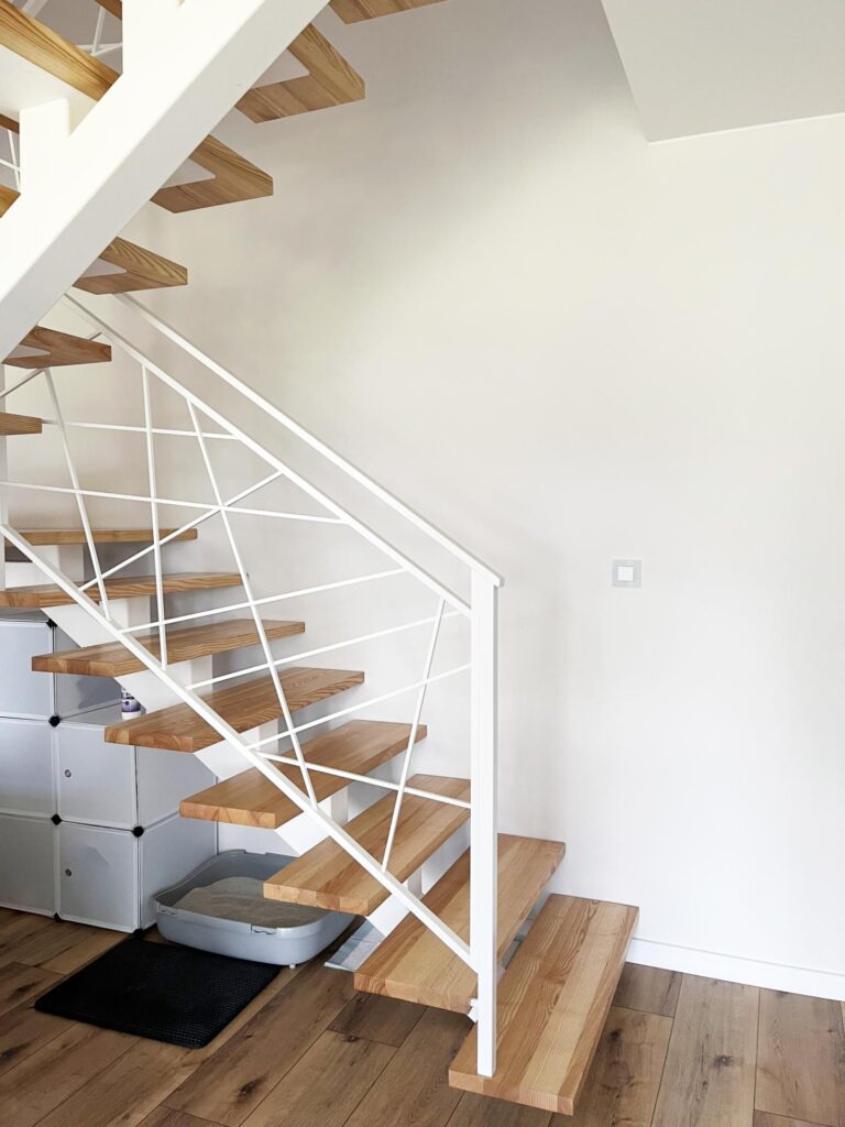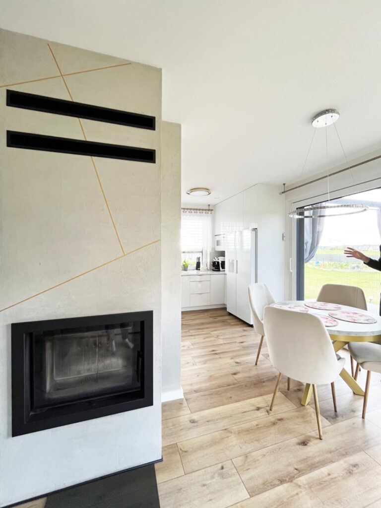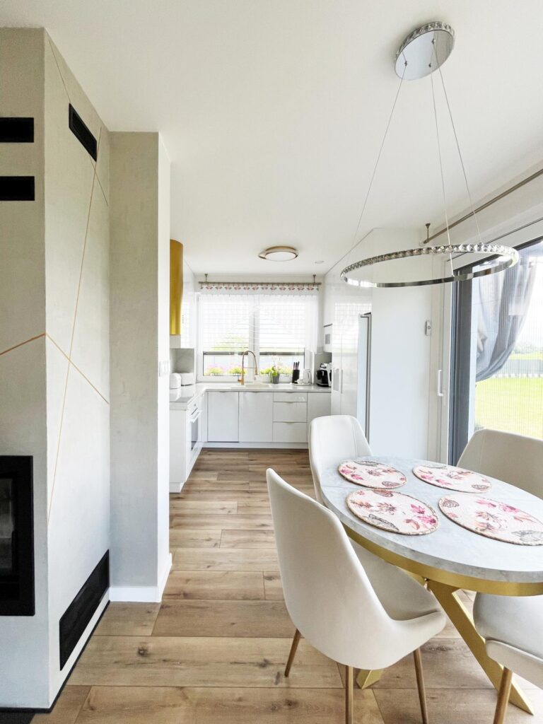 - Podłoga: Usunięcie starych okładzin i położenie jednolitych paneli winylowych na całym parterze.