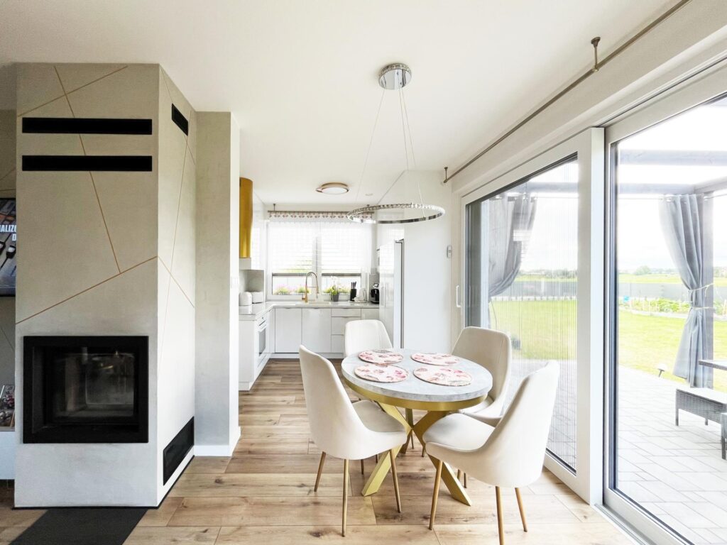 - Komfort: Piekarnik w wysokiej zabudowie, stolik śniadaniowy i zintegrowana, jednolita podłoga na całym parterze.